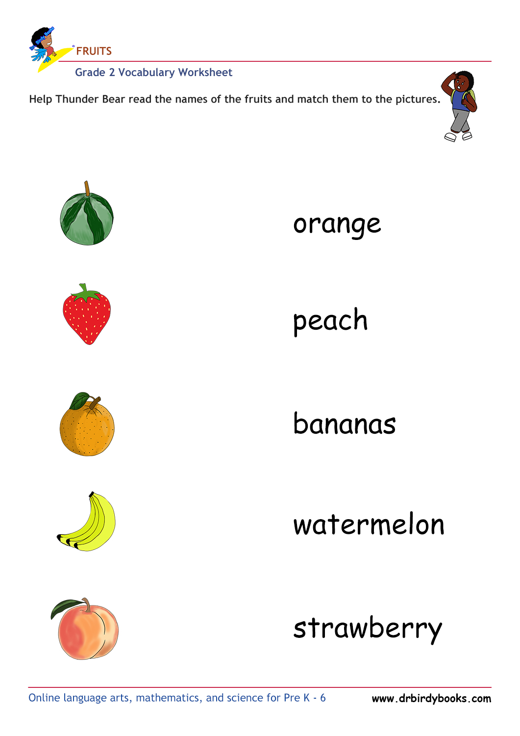 This interactive Grade 2 vocabulary worksheet helps students match fruits with their names through engaging activities. Perfect for building language skills!