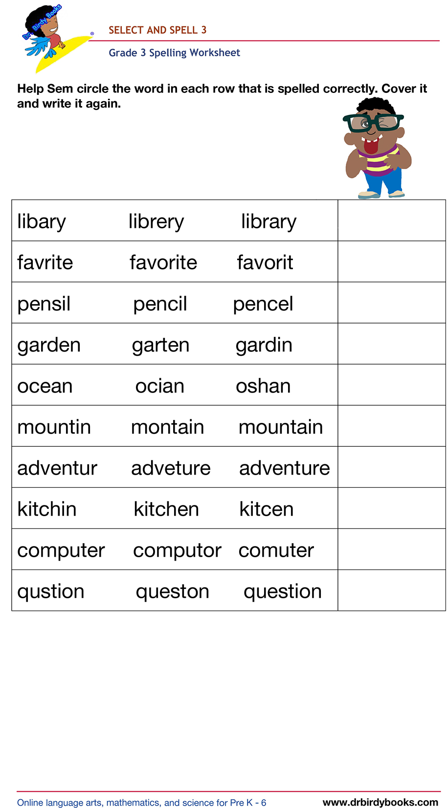 This engaging Grade 3 worksheet helps students practice selecting the correct spelling of words and writing them, making spelling fun and effective!