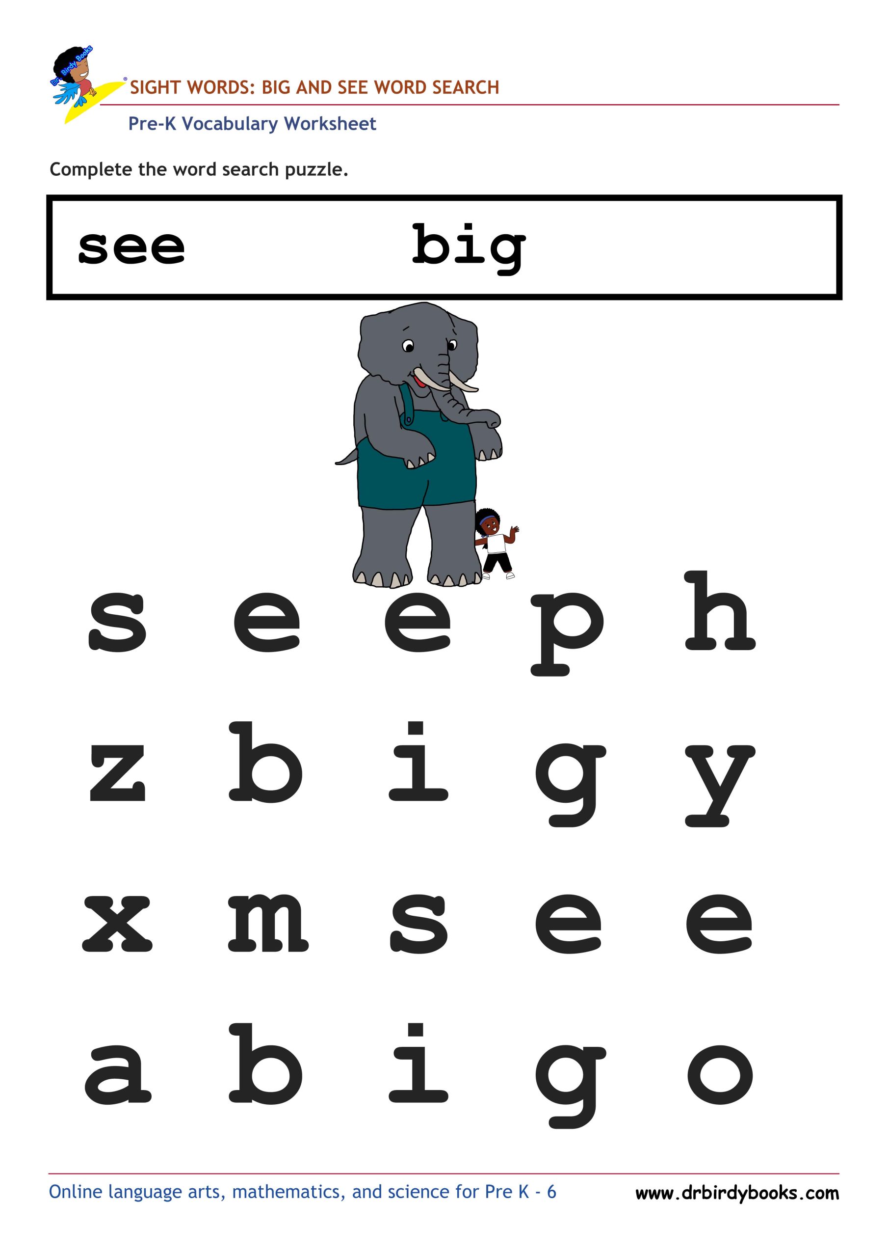Pre K Vocabulary Word Search Puzzles Worksheet featuring simple words like "the" and "can."